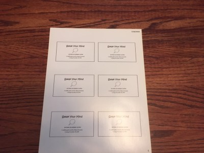 Yesterday morning I woke up around 7:30-ish and couldn’t fall back asleep because I was a bundle of nerves. The bookmark thing was still on my mind, so I got the idea to make a makeshift black and white promo card for Speak Your Mind instead using PowerPoint. The cards were printed on some photo paper we had around the house, and I printed them off six slides per page to ensure they were a fair size for a promo card.