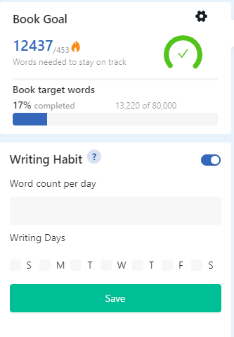 First, let’s cover the “Book Goal” section. This section allows you to set an overall wordcount goal for your project, as well as the desired deadline date. Based on the data you enter, Atticus will project, what I’m assuming is, the daily word count you will need to reach that goal. Above, you can see in this screenshot from earlier this year, that for my current WIP, On the Flip Side, Atticus suggested I should write 453 words a day to reach my goal of 80,000 words by my deadline.